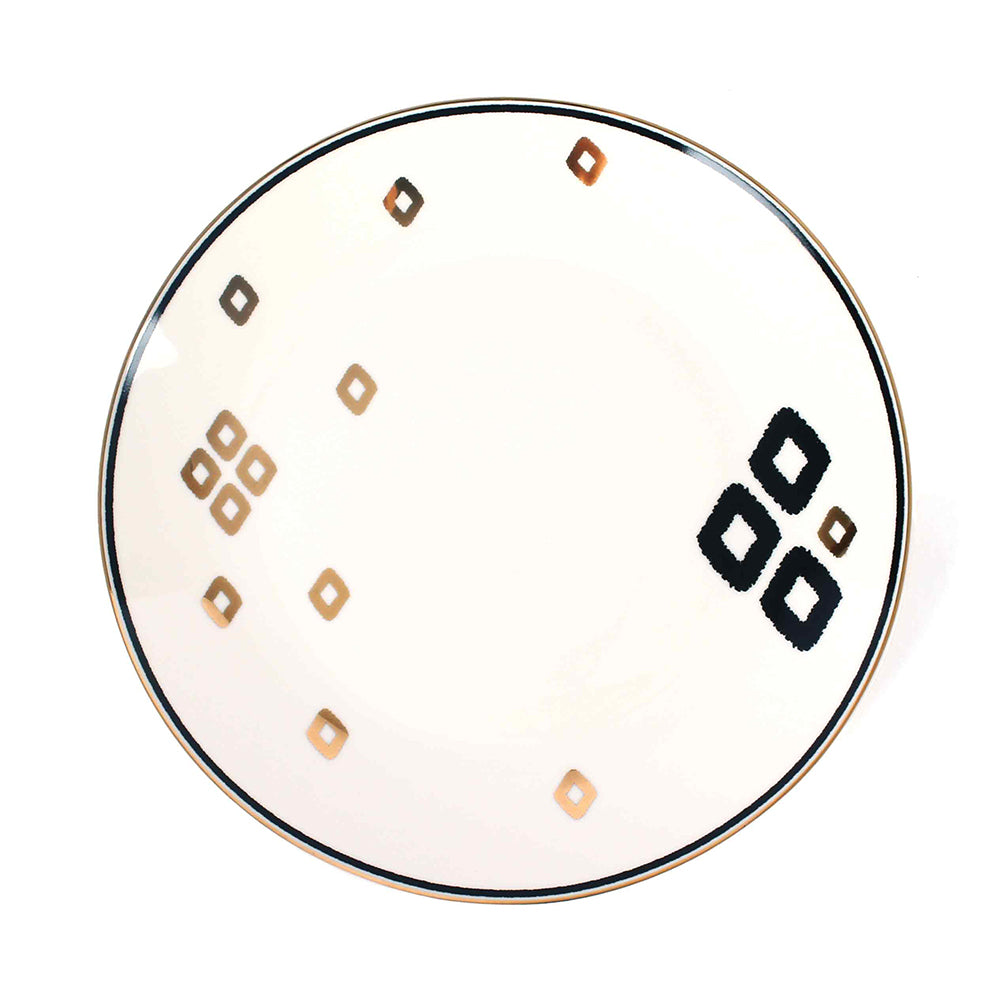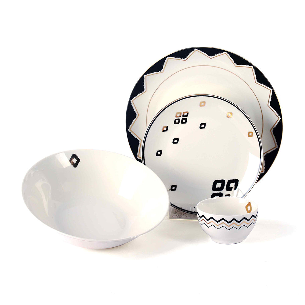 Designed for grand dining experiences, the Qalla Porcelain 27-Piece Dinner Set brings luxury and functionality together in perfect harmony. Featuring intricate geometric motifs with a hand-painted effect and gold detailing, this monochrome palette set is a timeless statement of contemporary design. Ideal for eight guests, it offers a complete collection of plates, bowls, and serveware for elegant hosting. Expertly crafted from high-quality porcelain, it is lightweight, durable, lead-free, and dishwasher safe, making it as practical as it is beautiful. Housed in a premium gift box, this dinner set is a thoughtful luxury gift for those who appreciate fine design and craftsmanship. Sophisticated, modern, and versatile, the Qalla 27-Piece Set ensures every dining occasion is elevated with grace and artistry.