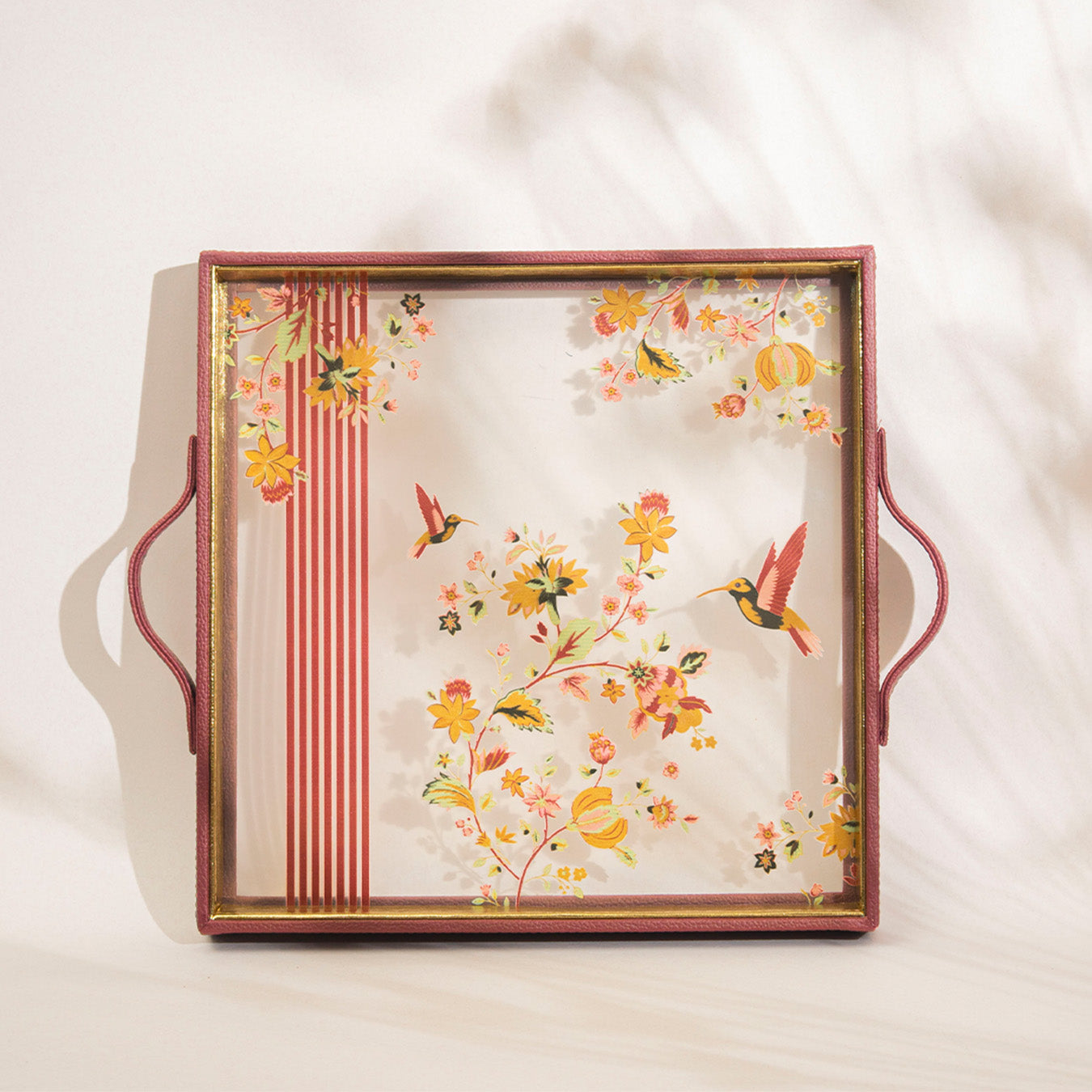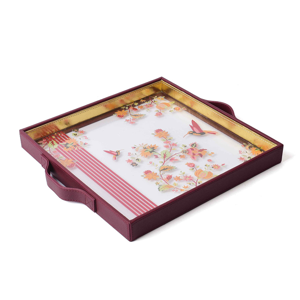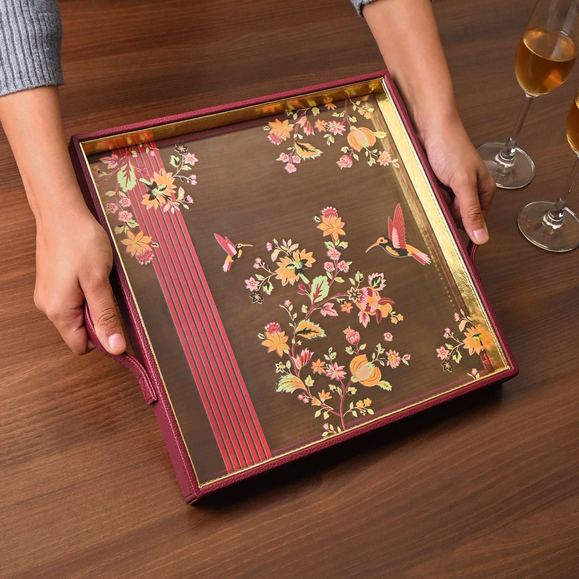 | Elevate your home décor with the Bloom Print Glass Leatherette Square Tray, a perfect blend of elegance and functionality. Crafted from premium leatherette and durable glass, this luxury serving tray showcases intricate botanical illustrations of peonies, chrysanthemums, and wild primrose, flourishing in shades of emerald green, soft peach, and muted tomato red. Inspired by nature’s renewal, its design adds a refreshing, artistic touch to any space. Ideal as a decorative tray for home décor, a statement coffee table tray, or a stylish serving tray, this piece seamlessly fits into both modern and classic interiors. Whether you're hosting guests, curating a sophisticated tablescape, or looking for an elegant gifting option for housewarming, weddings, or festive occasions, this tray is a must-have. Easy to clean, durable, and timelessly chic, the Bloom Tray brings effortless luxury to your home. |