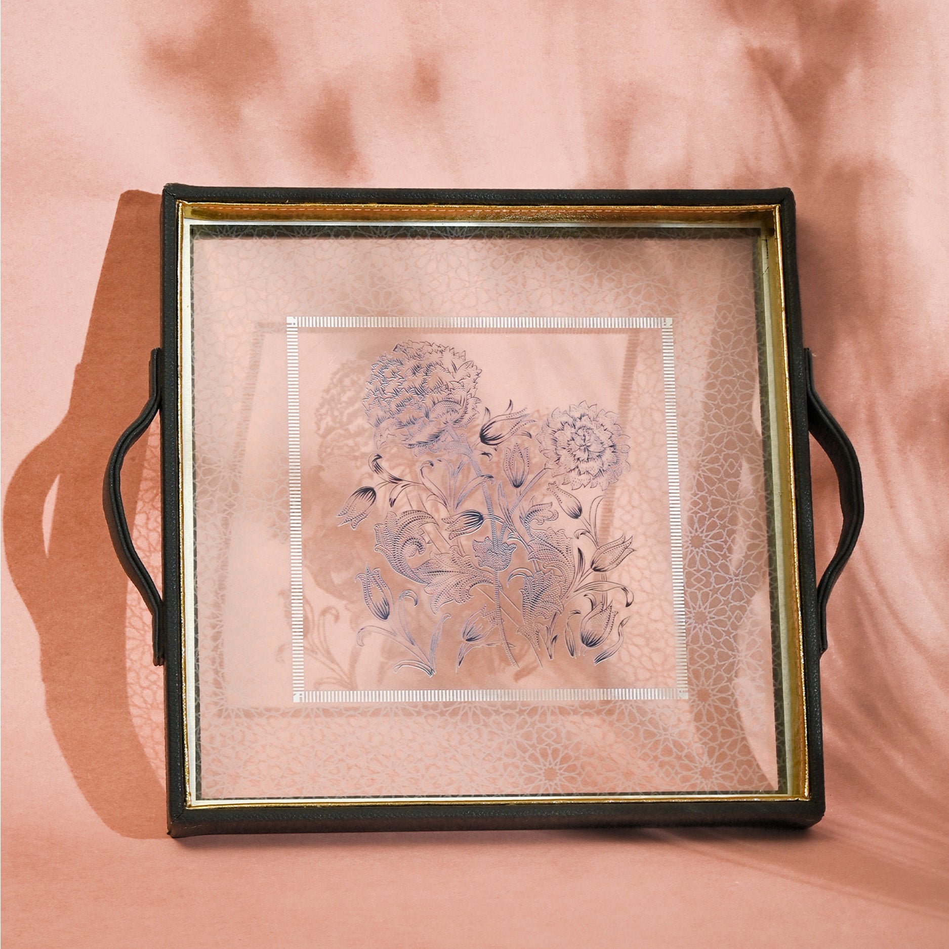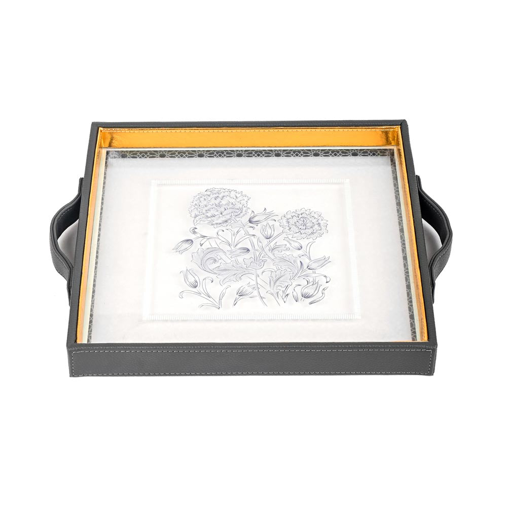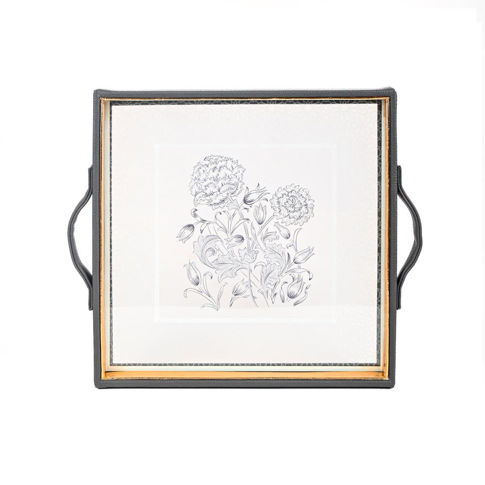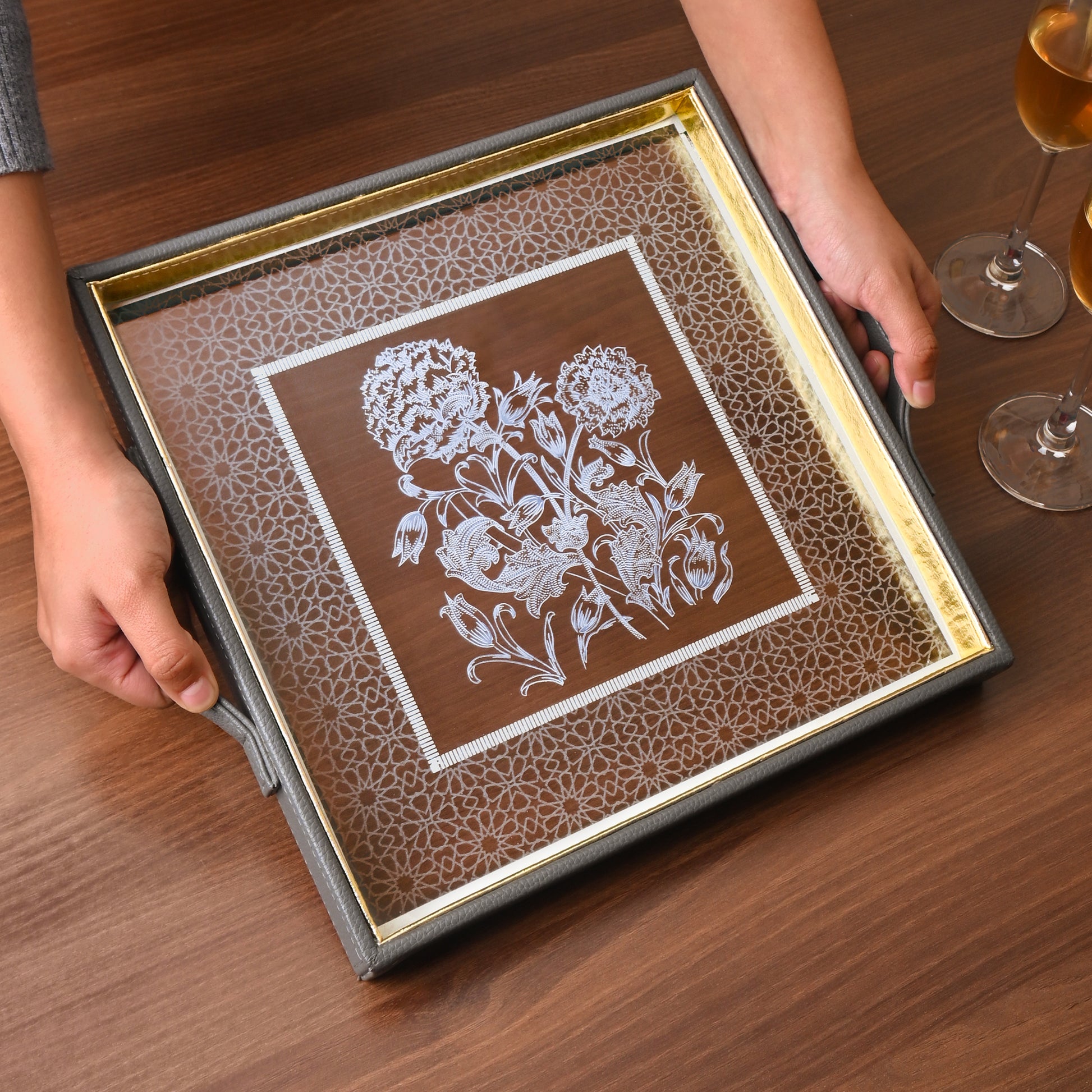 | Unfurl springtime elegance on your table year-round with the Grey Iris Print Glass Leatherette Square Tray. A perfect blend of style and function, this premium serving tray features a sleek glass surface set atop a durable leatherette base, making it an essential for both hosting and home décor. The light grey floral illustrations on the glass base are a modern take on painterly botanical art, with powder blue iris blossoms, slender stems, and delicate petals forming a timeless composition. Subtle gilded geometric accents add a touch of understated luxury, making this tray a stunning centerpiece for any setting—whether it’s a cozy family brunch or an elegant dinner party. Stylish, durable, and easy to clean, this tray is a must-have for those who appreciate functional elegance. It also makes a perfect gift for housewarmings, weddings, or festive occasions. Let the Grey Iris Tray bring effortless charm and sophistication to your gatherings. |