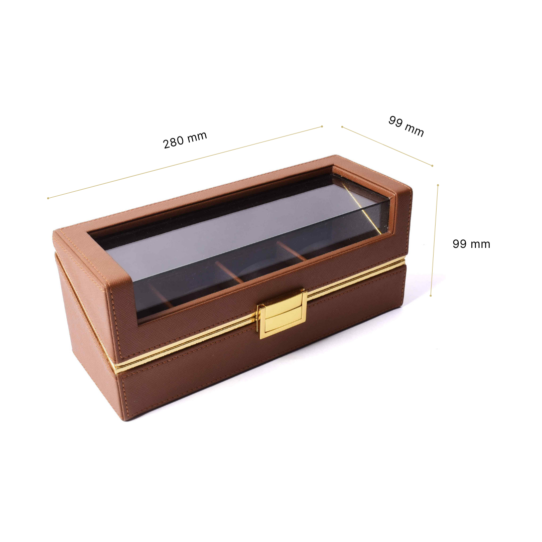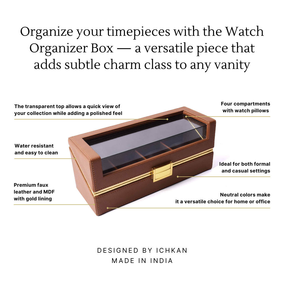 Organize your timepieces with the Midnight Collection Watch Organizer Box in deep, earthy brown—a timeless piece that brings warmth and class to any space. Crafted from premium leatherette, this organizer is finished with meticulous hand-stitching, a decorative golden border, and a durable golden hinge for a touch of sophistication. With four spacious compartments, it’s designed to store your watches securely and stylishly. The transparent top allows a quick view of your collection while adding a polished feel. This rich brown hue, inspired by natural elegance, blends seamlessly with classic and modern decor, making it the perfect addition to any well-curated space.
