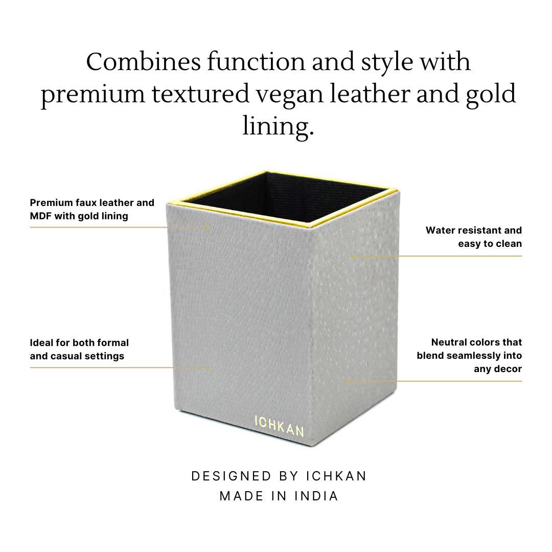 This multipurpose pen holder is here to add funtion to your table while also making a style statement with its premium textured vegan leather and gold lining.