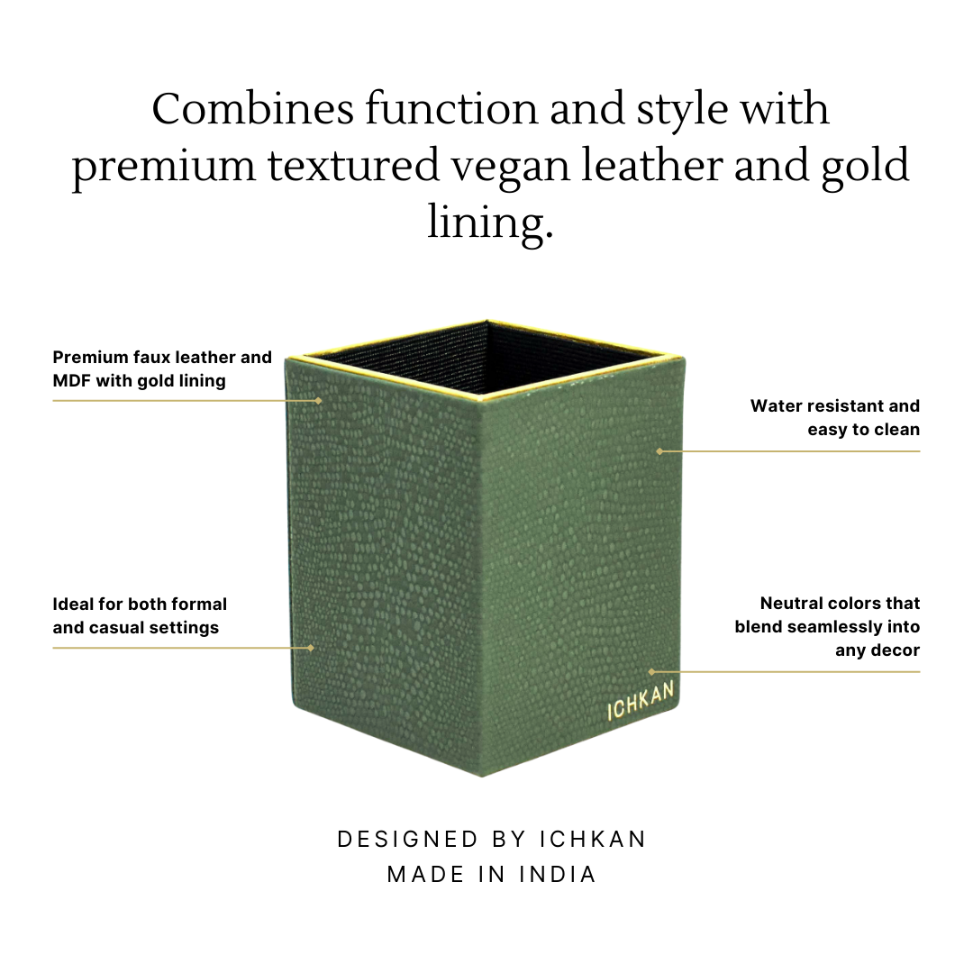 This multipurpose pen holder is here to add funtion to your table while also making a style statement with its premium textured vegan leather and gold lining.